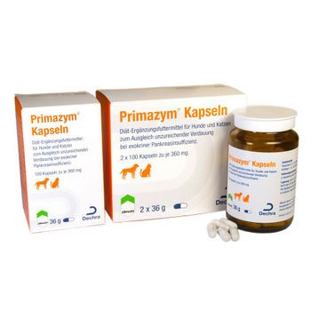Nachfolger vom beliebten Albrecht Pankreatin. DECHRA Primazym sind Verdauungsenzyme zur Unterstützung der Eiweiß-, Fett- und Kohlenhydratverdauung bei Pankreasinsuffizienz und Verdauungsproblemen bei Hund und Katze.