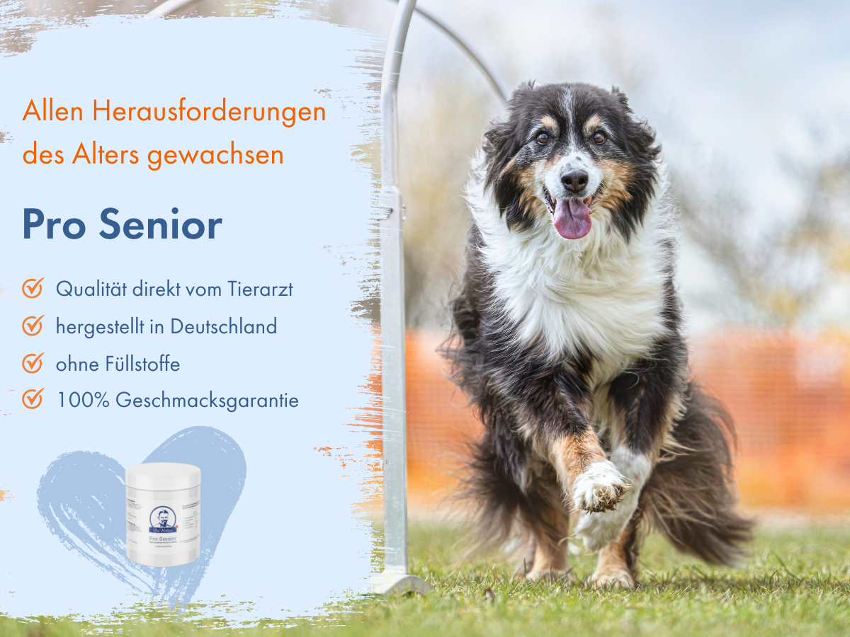 Ausgewogenes Seniorfutter: Ältere Hunde haben besondere Ernährungsbedürfnisse, auf die ihr Hundefutter abgestimmt sein sollte. Ernährungsmängel oder Überversorgung können sich negativ auf die Hirnfunktion älterer Hunde auswirken. Mit einem hochwertigen Seniorfutter stellen Sie sicher, dass Ihr alter Hund alle Nährstoffe, die er braucht, in der richtigen Menge bekommt.